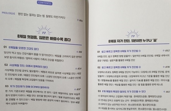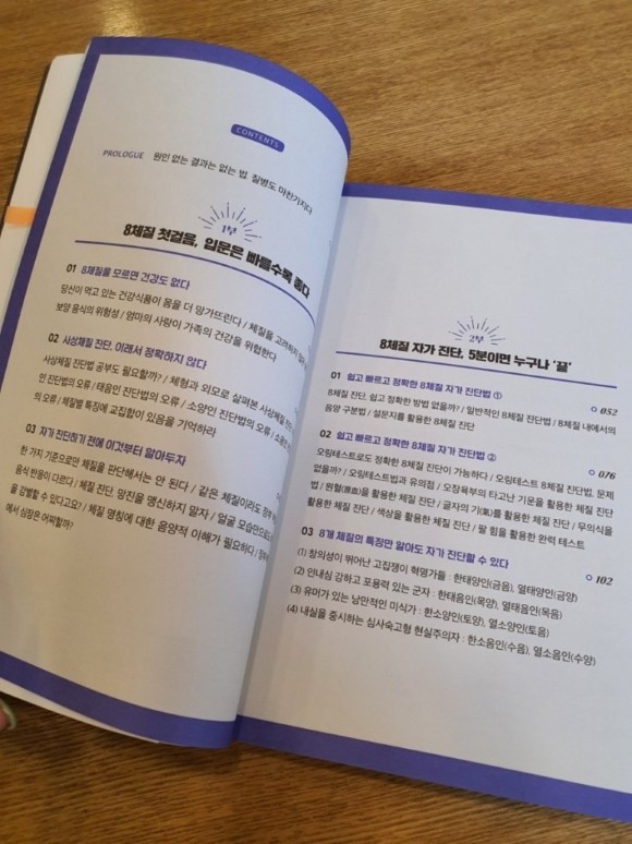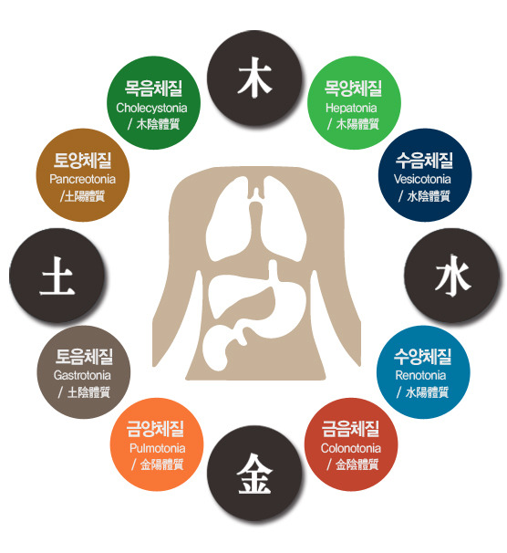 크게 두 가지로 분류할 수 있는 "금양, 금음, 토양, 토음, 목양, 목음, 수양, 수음"의 여덟 가지 체질로 나뉘며, 각 체질에 따라 체질별로 적합한 음식, 운동, 생활 습관이 제시됩니다.
